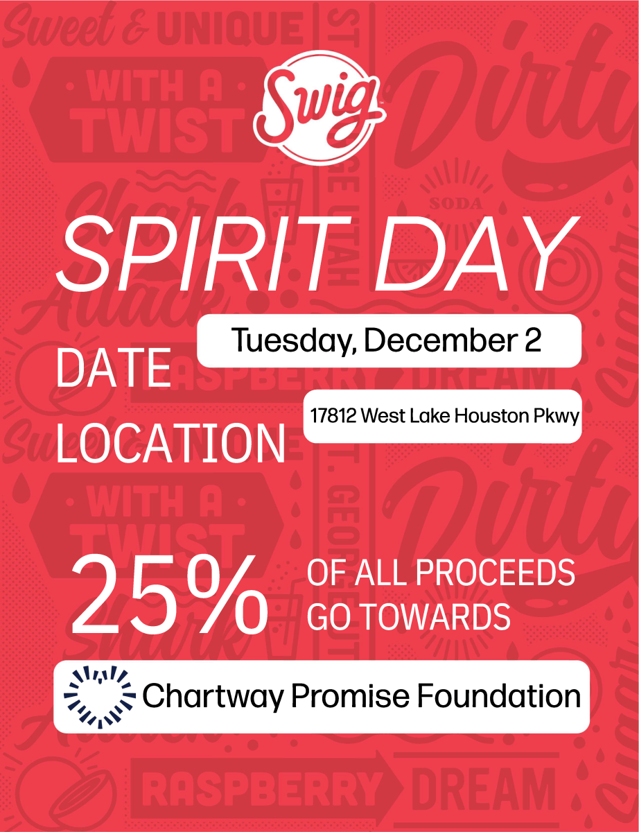 On Dec. 2nd, Swig is teaming up with Chartway Promise Foundation for Giving Tuesday! When you order your favorite Swig drink, say “Chartway Promise” at checkout, and 25% of your purchase will be donated to the Chartway Promise Foundation. Together, we can help make a lasting impact for medically fragile children and their families.