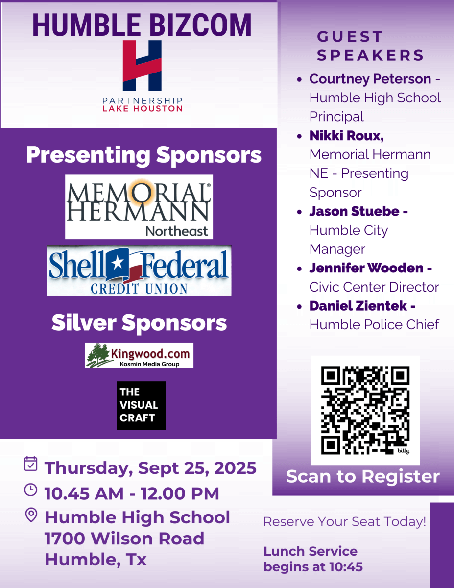 Join us at the Humble BizCom, where businesses, community members, and school officials come together to address the unique needs and issues of the Lake Houston Area . This is a wonderful chance for area citizens, community organizations, businesses, and anyone interested to connect and collaborate. The event is free, and we’re pleased to offer a complimentary lunch to those who RSVP.