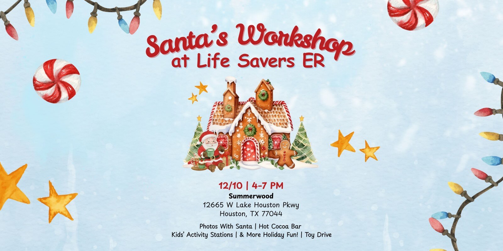 Join us for Santa’s Workshop at Life Savers ER! Bring the whole family for a festive holiday celebration featuring photos with Santa, a cozy hot cocoa bar, kids’ activity stations, and plenty of cheerful seasonal fun.